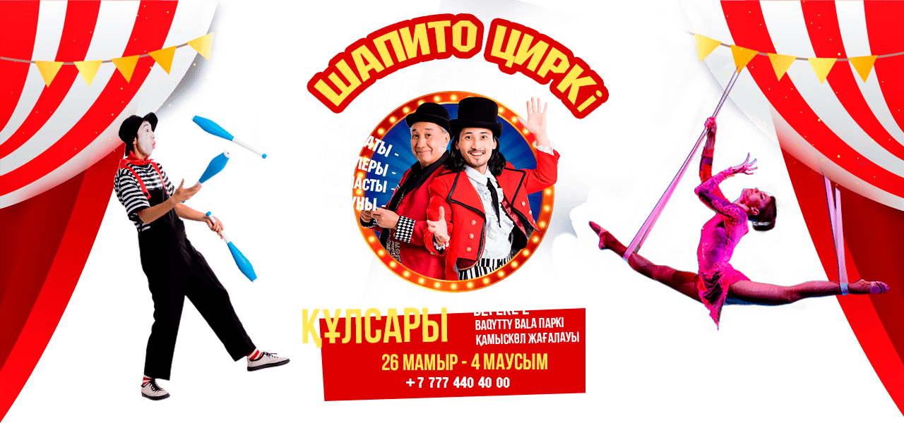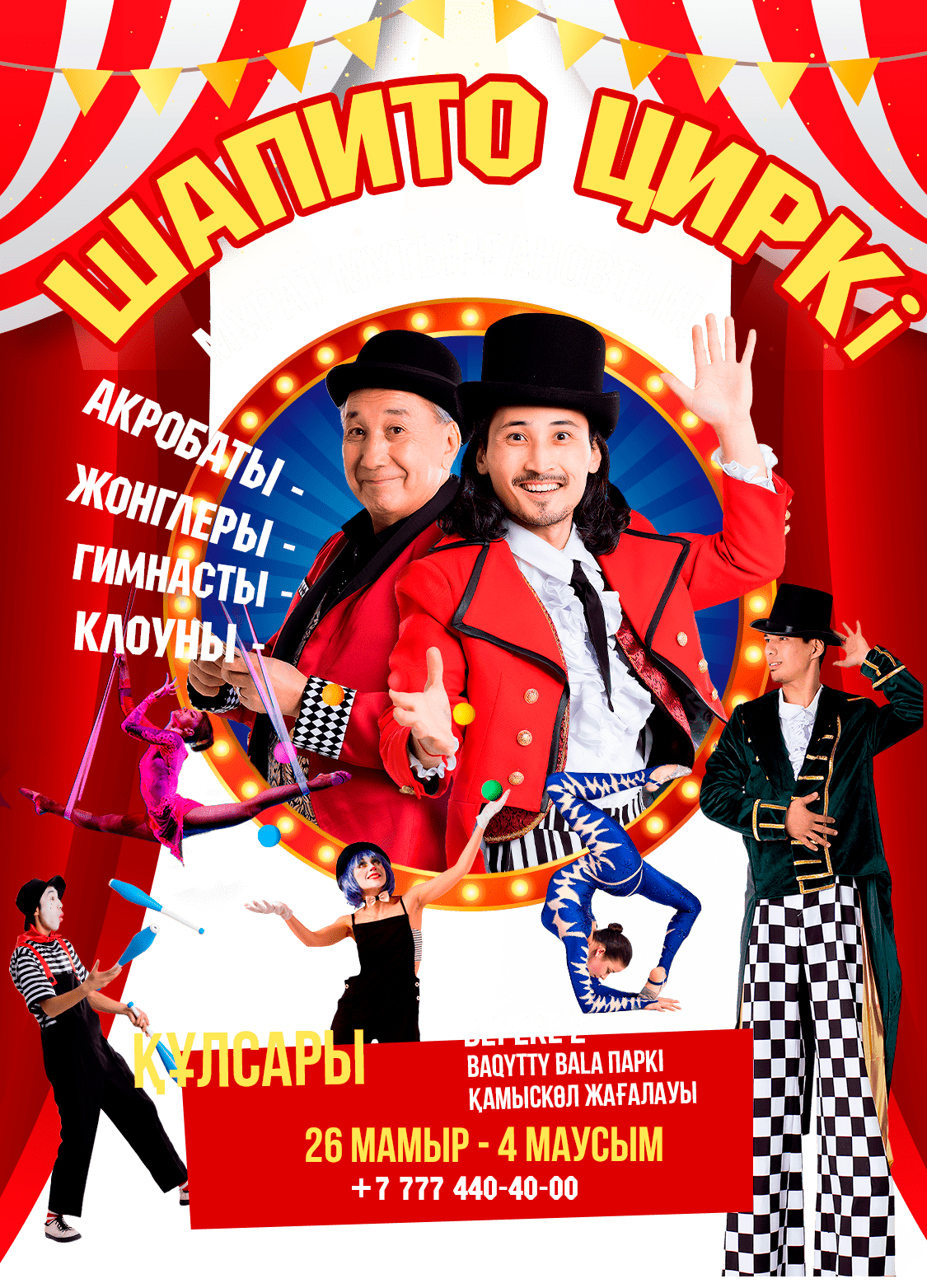 Қалада тұңғыш рет Мұрат Мұтырғановтың шапито циркі! Бұл - бүкіл отбасы мүшелеріне арналған бірегей және ерекше қызықты цирк шоуы! Алуан түрлі жанр, жарқын сахналық бейнелер, жоғары кәсіби деңгейдегі әртістер, қауіпті трюктер мен әсерлі қойылымдар кез - келген жастағы көрерменнің көңілінен шығады!